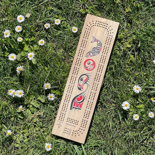 3- track Crib Boards featuring indigenous designs. Includes a free deck of playing cards and 9 pegs (3 colours).