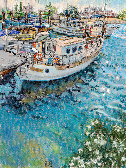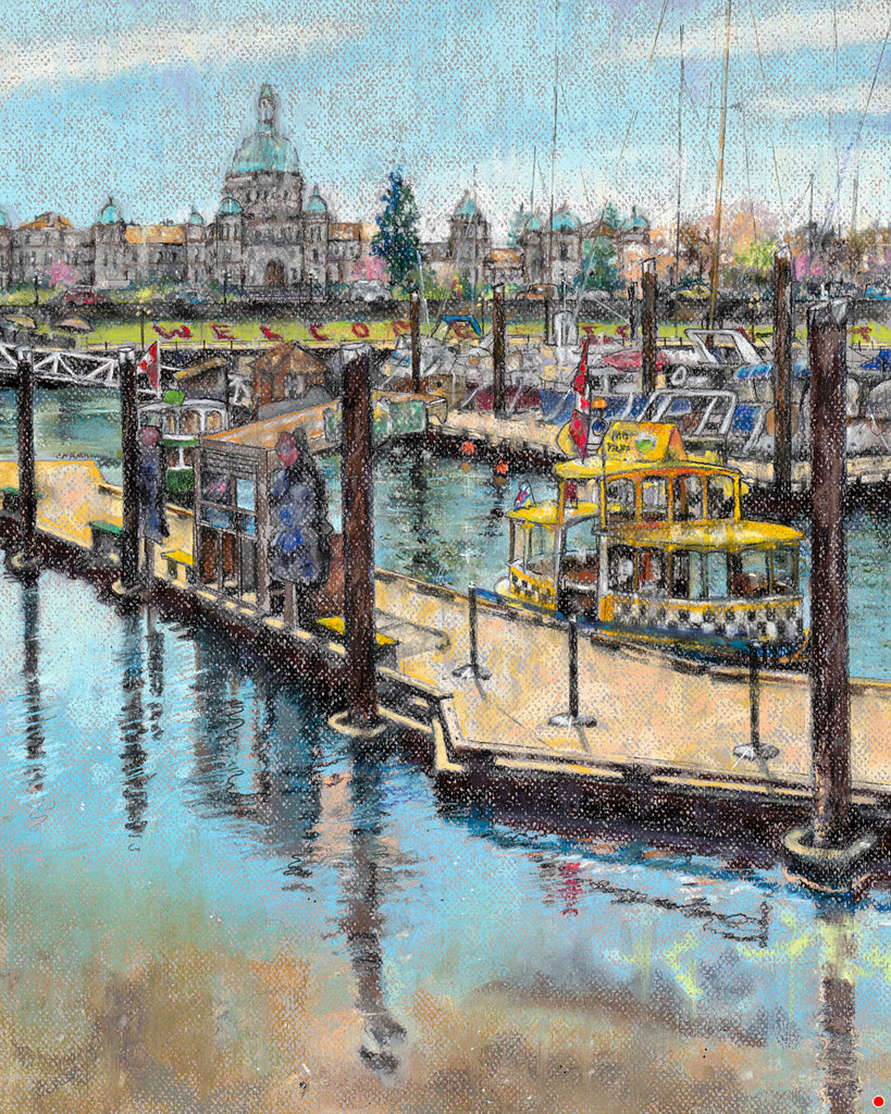 These chalk pastel artworks feature scenes of the Victoria Inner Harbour.